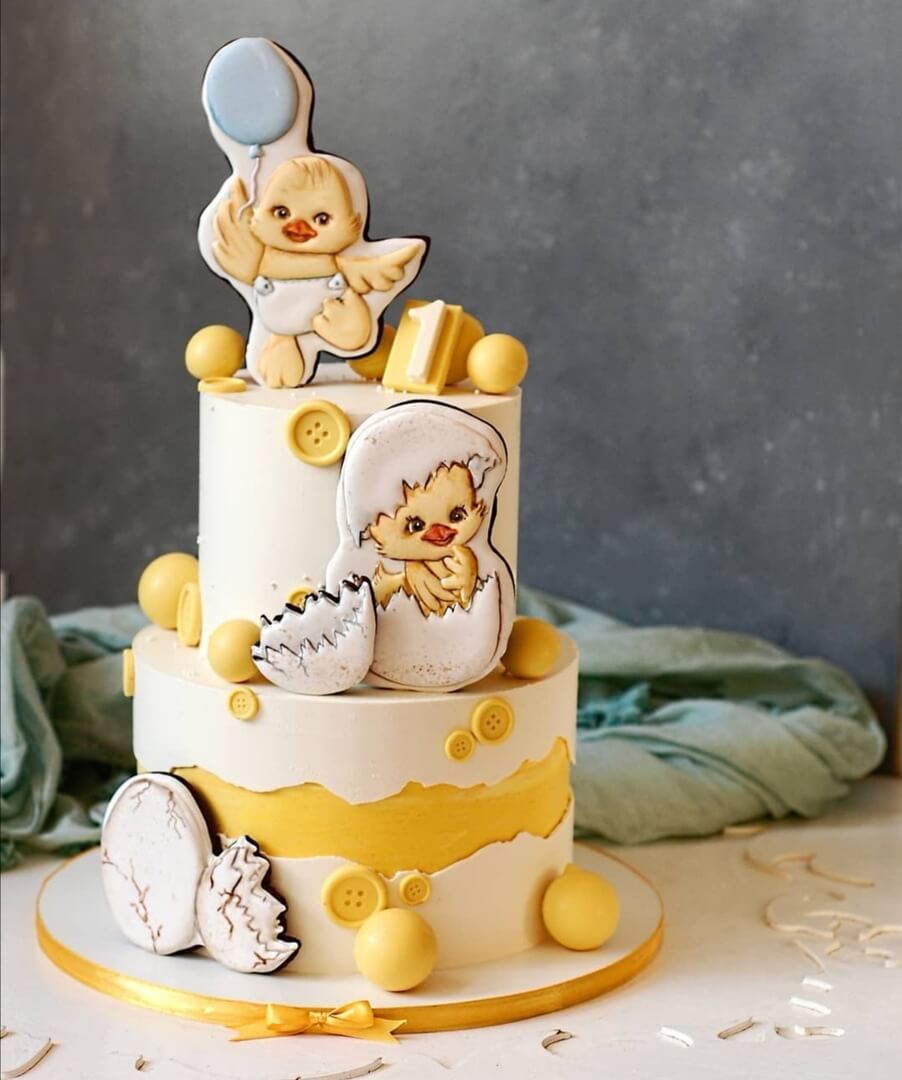 Яркий и игривый тортик с маленькими цыплятами прекрасно подойдет в качестве подарка для семьи с новорожденным малышом