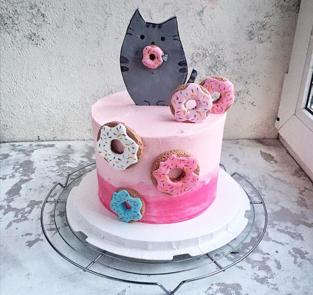 Очаровательный кот Пушинчик, поглощающий пончики, станет отличным украшением для милого поздравительного тортика