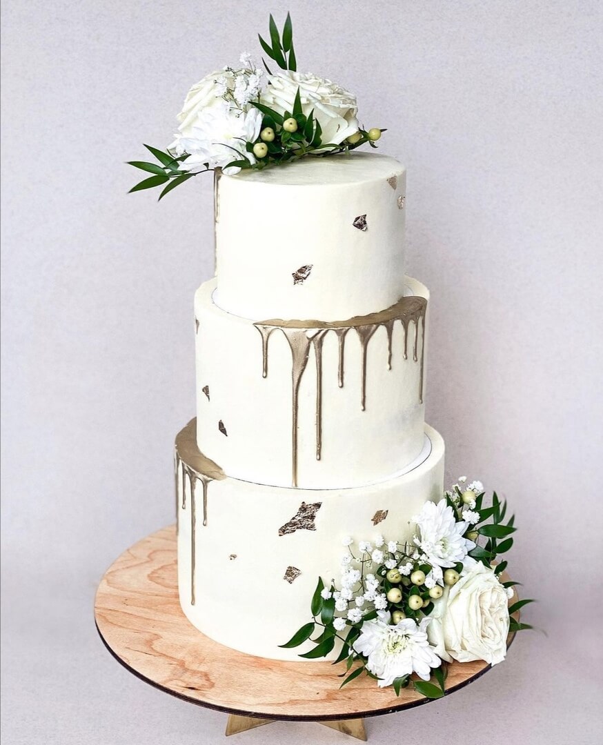 Классический многоярусный свадебный торт, украшенный свежими цветами и серебряными подтеками в качестве изюминки