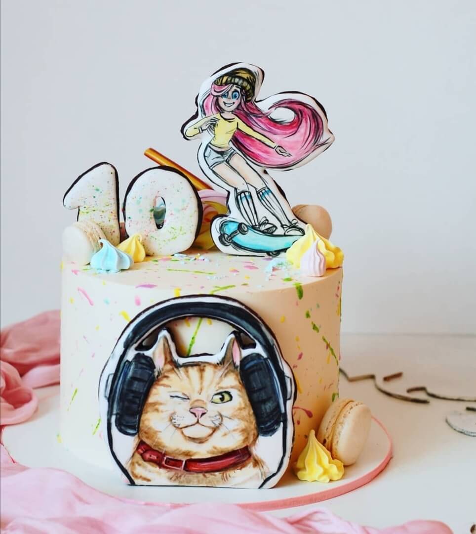 Подростковый девчачий тортик, отражающий ее увлечения - лонгборд, музыку и котиков