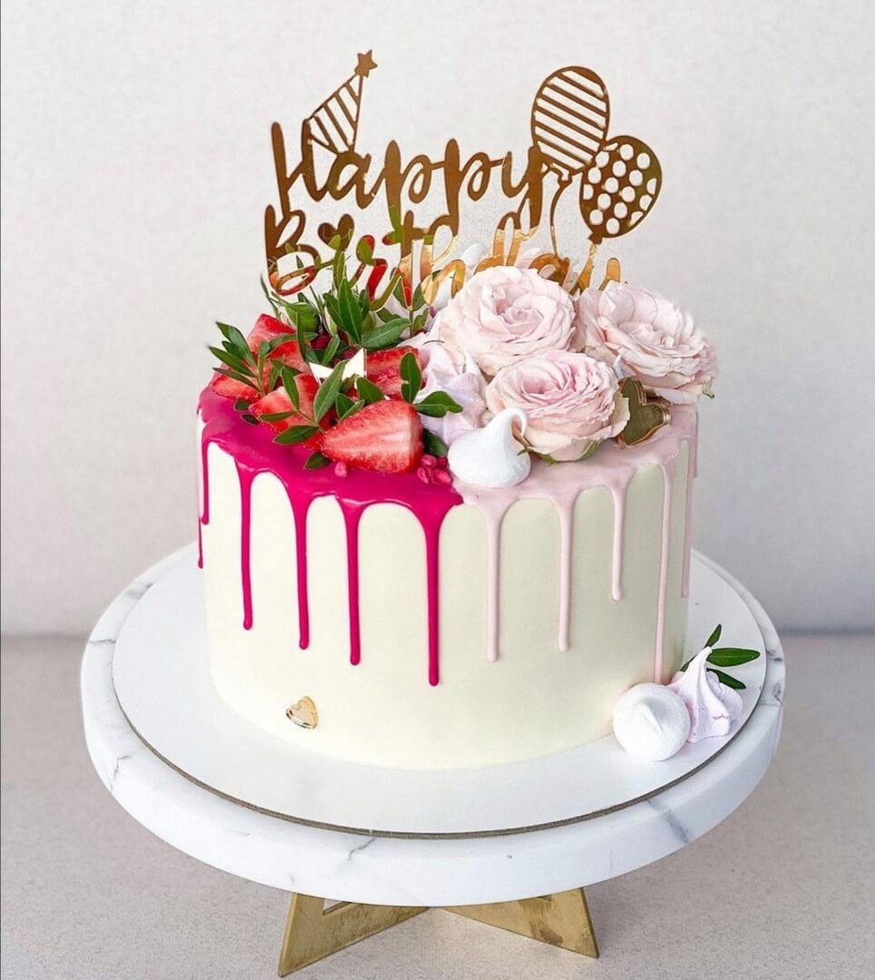 Нежное и эффектное сочетание аппетитности поздравительного торта и свежести настоящих живых цветов станет отличным подарком ко дню рождения!